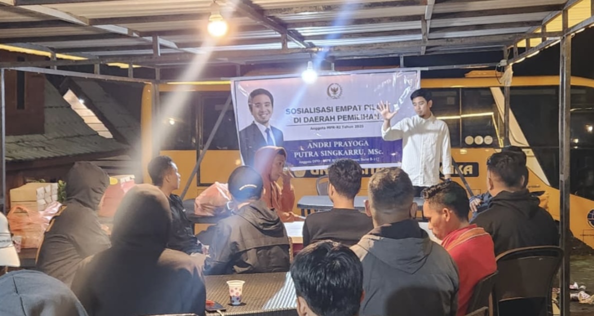 POLMAN (pelitapagi.com) Anggota MPR RI dari Provinsi Sulawesi Barat, Andri Prayoga Putra Singkarru, MSc., kembali melaksanakan komitmen kebangsaannya dengan menggelar Sosialisasi Empat Pilar MPR RI. Kegiatan yang berlangsung di Hotel Ratih Polewali Mandar ini merupakan pembuka dari rangkaian tujuh kegiatan sosialisasi yang dijadwalkan di penghujung tahun 2025.