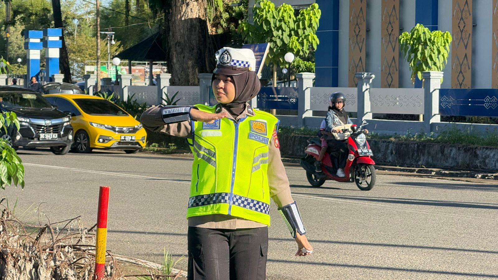 Setiap pagi, petugas Ditlantas Polda Sulbar aktif mengatur lalu lintas di setiap persimpangan jalan utama di Mamuju. Salah satunya terlihat di sekitar PSC Mamuju, Rabu (3/12/25), di mana petugas dengan penuh semangat dan ketulusan hati memberikan pelayanan terbaiknya.