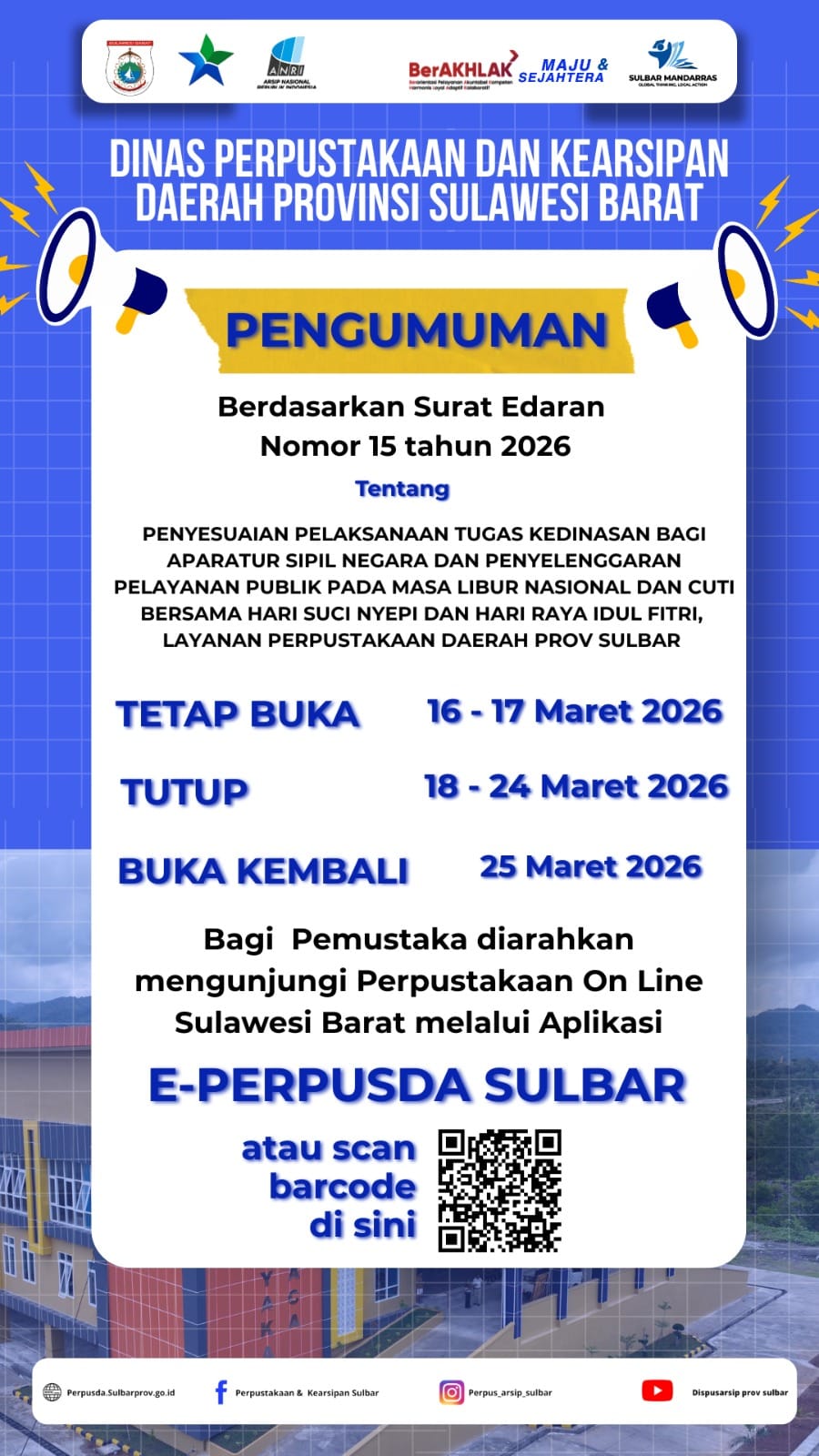 Layanan perpustakaan Perpusip Sulbar masih dibuka pada tanggal 16 hingga 17 Maret 2026 guna memberikan kesempatan kepada masyarakat untuk tetap memanfaatkan fasilitas literasi yang tersedia. Setelah itu, layanan perpustakaan ditutup sementara pada tanggal 18 sampai 24 Maret 2026 sehubungan dengan libur nasional dan cuti bersama.