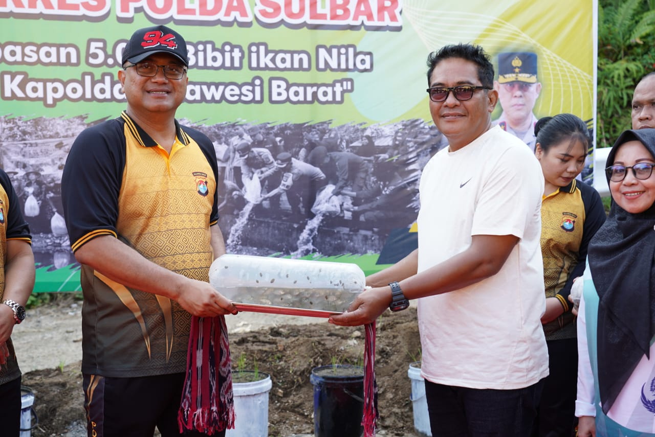 MAMUJU (pelitapagi.com) Kepolisian Daerah Sulawesi Barat menunjukkan komitmen nyata dalam mendukung program ketahanan pangan berkelanjutan di wilayahnya. Kapolda Sulbar, Irjen Pol Adi Deriyan Jayamarta, bersama jajaran pejabat utama Polda, turun langsung dalam kegiatan penebaran 5.000 bibit ikan nila di area Pekarangan Pangan Bergizi Biddokkes Polda Sulbar, Jumat (10/10/25).