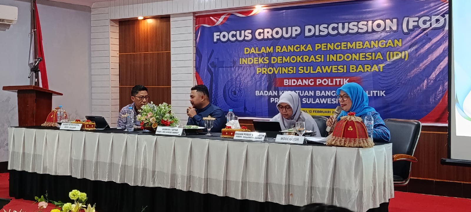 Mamuju (pelitapagi.com) Pemerintah Provinsi Sulawesi Barat melalui Badan Kesatuan Bangsa dan Politik (Kesbangpol) Provinsi Sulawesi Barat melaksanakan kegiatan Focus Group Discussion (FGD) dalam rangka pengembangan Indeks Demokrasi Indonesia (IDI) bidang Politik, bertempat di Hotel Berkah, Kamis (12/02)