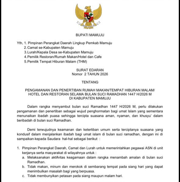 Mamuju (pelitapagi.com) Demi menjaga nilai-nilai toleransi dan mewujudkan keamanan dan ketertiban umum serta terciptanya suasana yang kondusif dalam menjalankan ibadah bagi umat islam di bulan suci ramadhan, pemerintah kabupaten mamuju mengeluarkan surat edaran tentang Pengamanan dan Penertiban Rumah Makan,tempat hiburan malam (THM) hotel dan restoran.