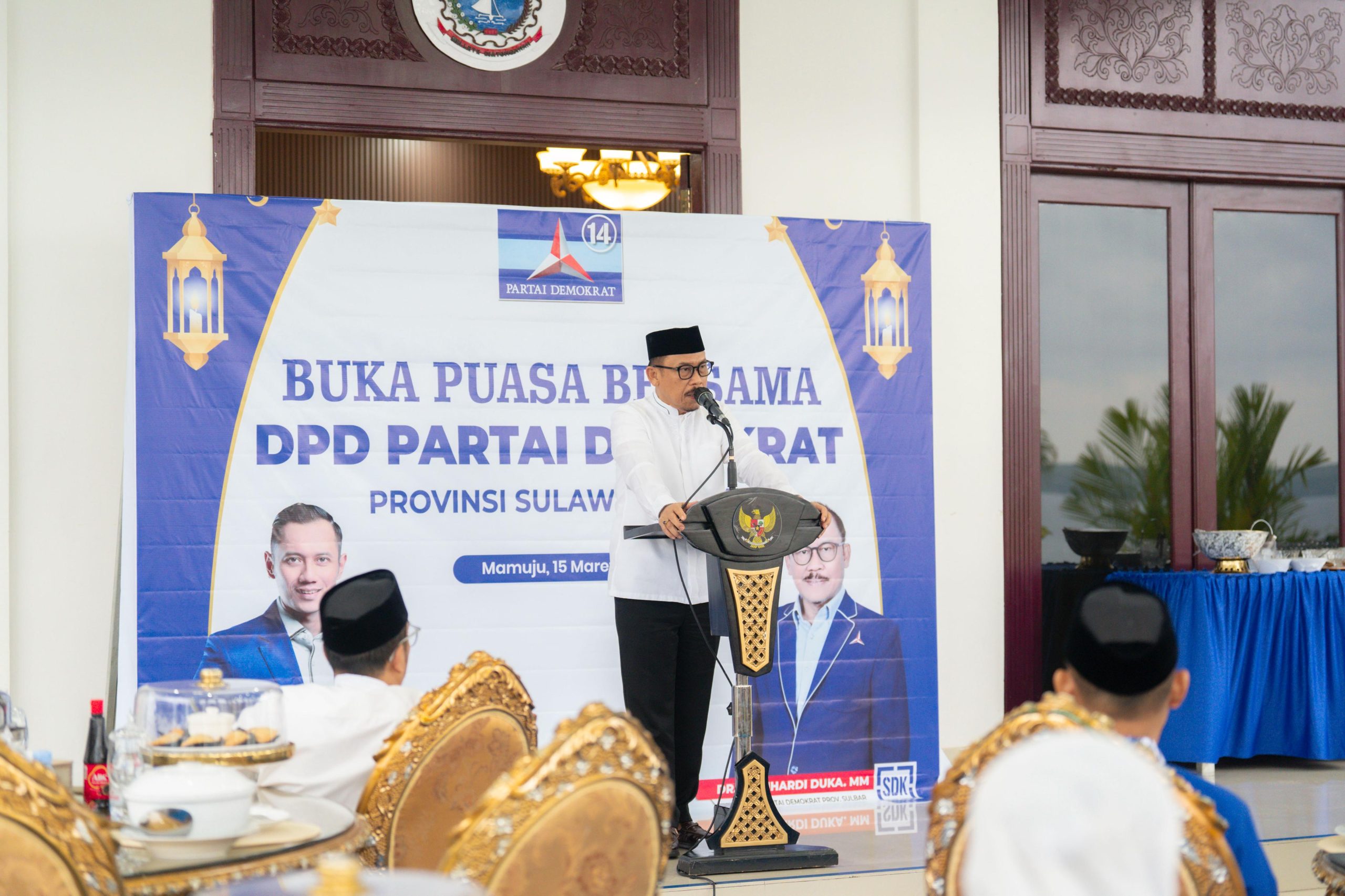 Mamuju (pelitapagi.com) Ketua DPD Partai Demokrat Sulawesi Barat, Suhardi Duka, mengingatkan kader partainya agar tidak melupakan asal-usul meski telah menduduki jabatan politik tinggi. Pesan itu disampaikannya saat acara buka puasa bersama keluarga besar Partai Demokrat Sulbar di rumah jabatan Gubernur Sulbar, Minggu (15/3).