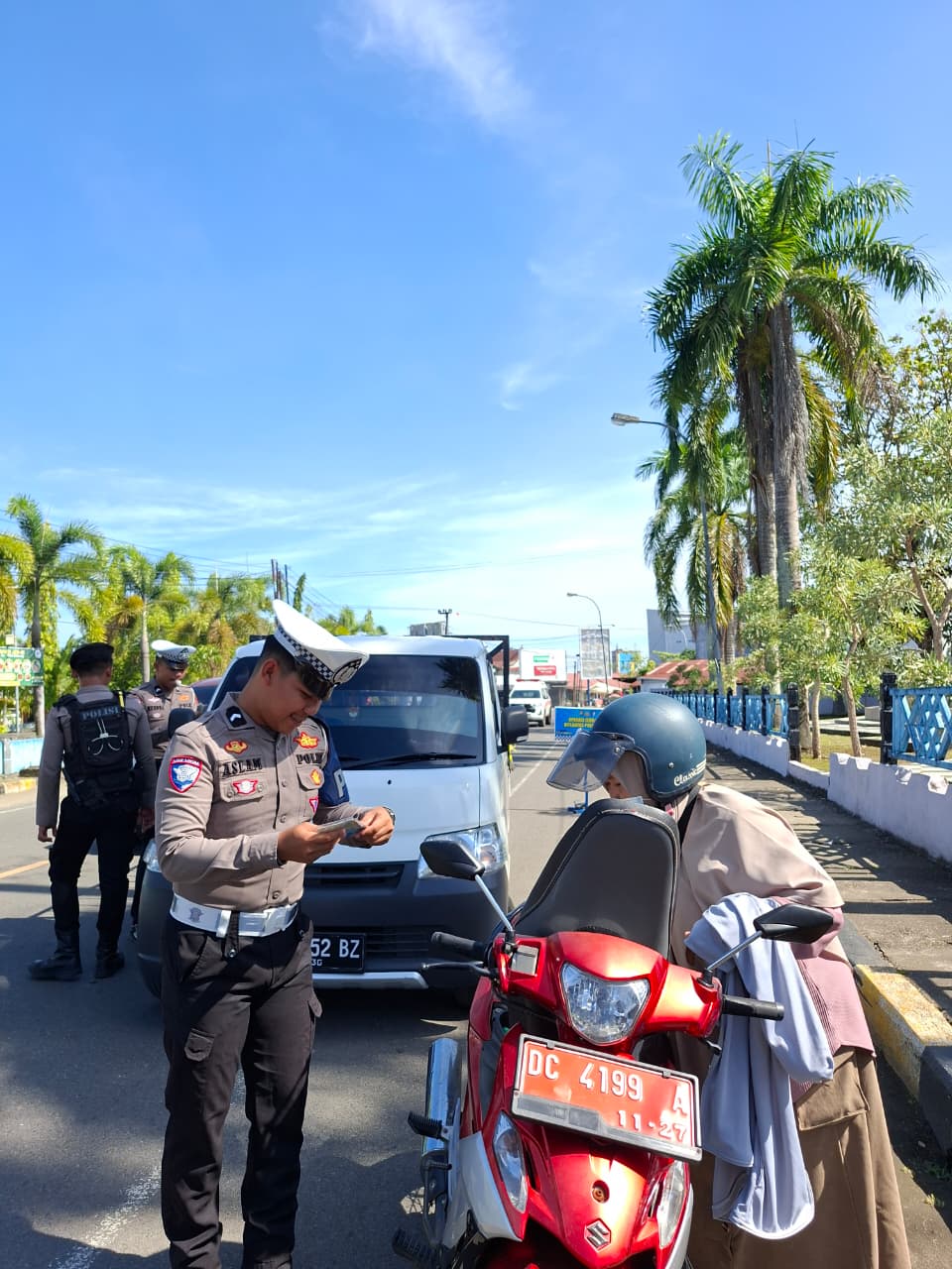 Setiap pengendara yang melintas terlihat diberhentikan untuk dilakukan pemeriksaan. Dengan pendekatan humanis serta komunikasi yang hangat, petugas memberikan edukasi terkait pentingnya keselamatan berkendara, mulai dari penggunaan helm dan sabuk pengaman hingga kelengkapan administrasi kendaraan.