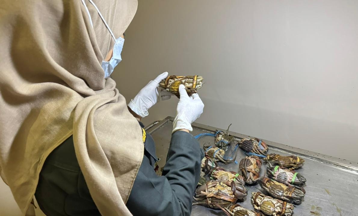 Mamuju (pelitapagi.com) Badan Karantina Indonesia (Barantin) melalui Balai Karantina Hewan, Ikan, dan Tumbuhan Sulawesi Barat (Karantina Sulawesi Barat) melakukan tindakan karantina penahanan terhadap 45 ekor kepiting bakau di Pelabuhan Feri Simboro, Mamuju pada Selasa (21/01). Komoditas perikanan yang dibawa penumpang tersebut, tidak dilengkapi dokumen karantina yaitu Sertifikat Kesehatan Ikan dari daerah asal.